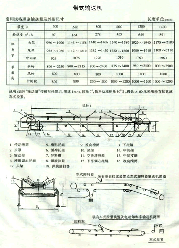 帶式輸送機的帶寬有六種:500;650;800;1000毫米。帶式輸送機的布置有五種型式。可根據輸送高度差,物料的種類、容量、輸送量、輸送長度等諸因素通過計算確定輸送機的布局以及所選用的膠帶寬度、帆布層和膠帶厚度。